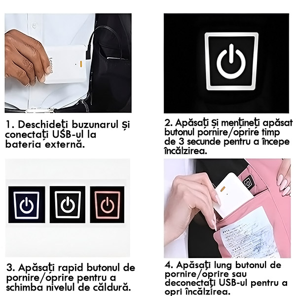Conectați la orice baterie externă de 5V/2A (nu este inclusă) pentru căldură portabilă și de lungă durată oriunde.